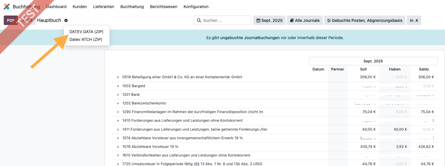 In Odoo findest du unter „Buchhaltung“ oder „Finanzen“ einen Export als DATEV- oder CSV-Datei. Diese Dateien gibst du deiner Steuerberatung oder nutzt sie direkt für ELSTER.